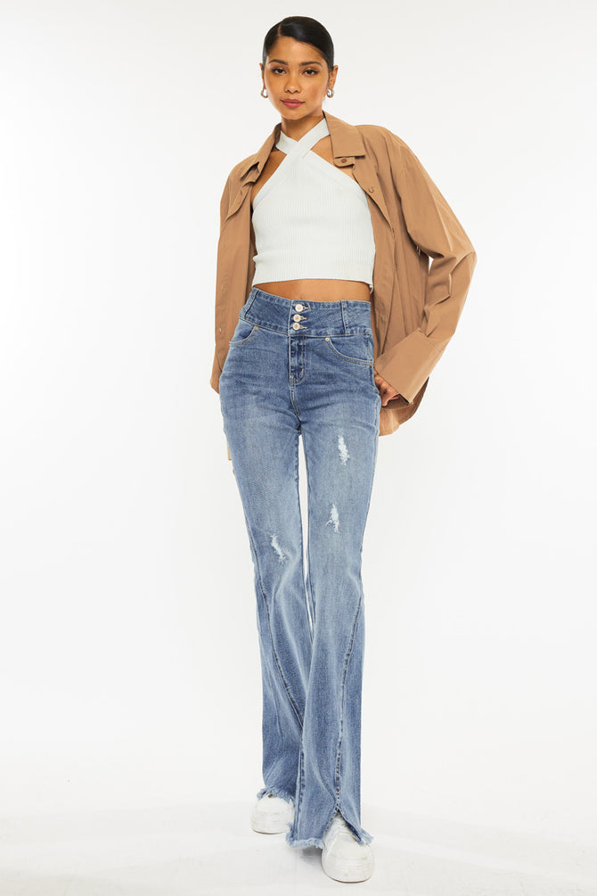 Vaqueros acampanados de lavado medio con cierre frontal de 3 botones, costura exterior retorcida, un toque de desgaste y detalle de dobladillo deshilachado.